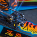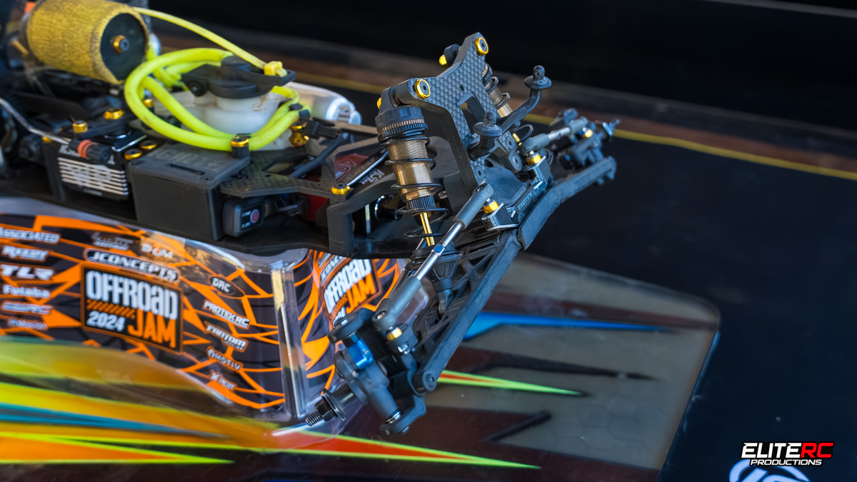 Starting at the front of the truck, the most obvious modification is the B7 adjustable KPI Front end. Having KPI in a 2wd stadium truck really helps numb corner entry and calm down the rear end, with more natural rotation in the center of a corner. In a gas truck, where weight bias is significantly further forward and can’t be moved back like the electric version, this helps driveability and is one of the easiest modifications to help improve the platform. Since my Mayako 8th scales were some of the first to have adjustable KPI in a C-hub configuration, I tested this setup at last year’s truck nationals and really found it was a huge difference-maker in the ability to push the truck comfortably. A Jconcepts alloy steering rack setup ensures the truck stays pointed in the right direction.