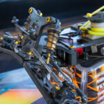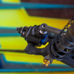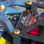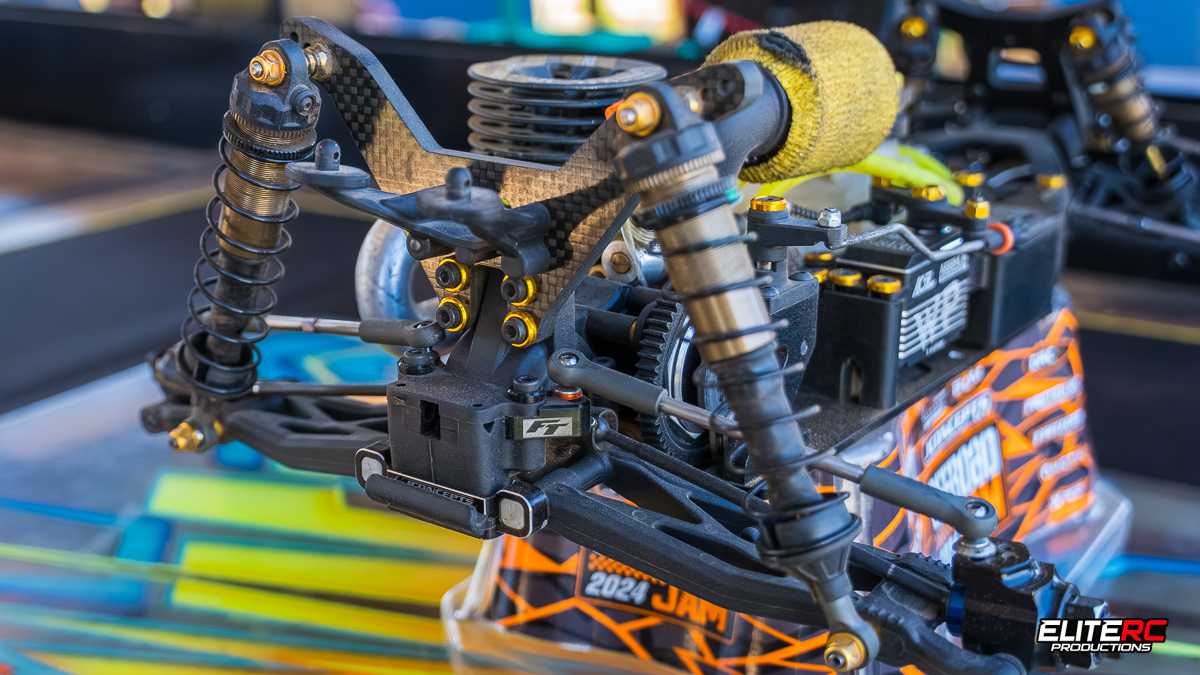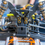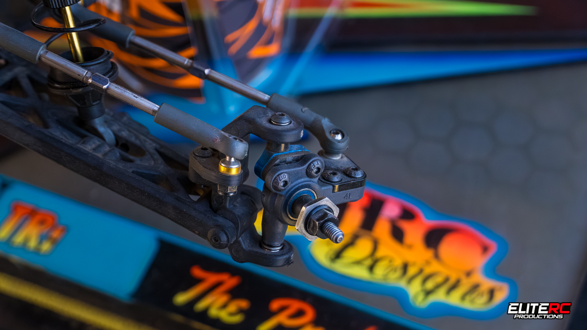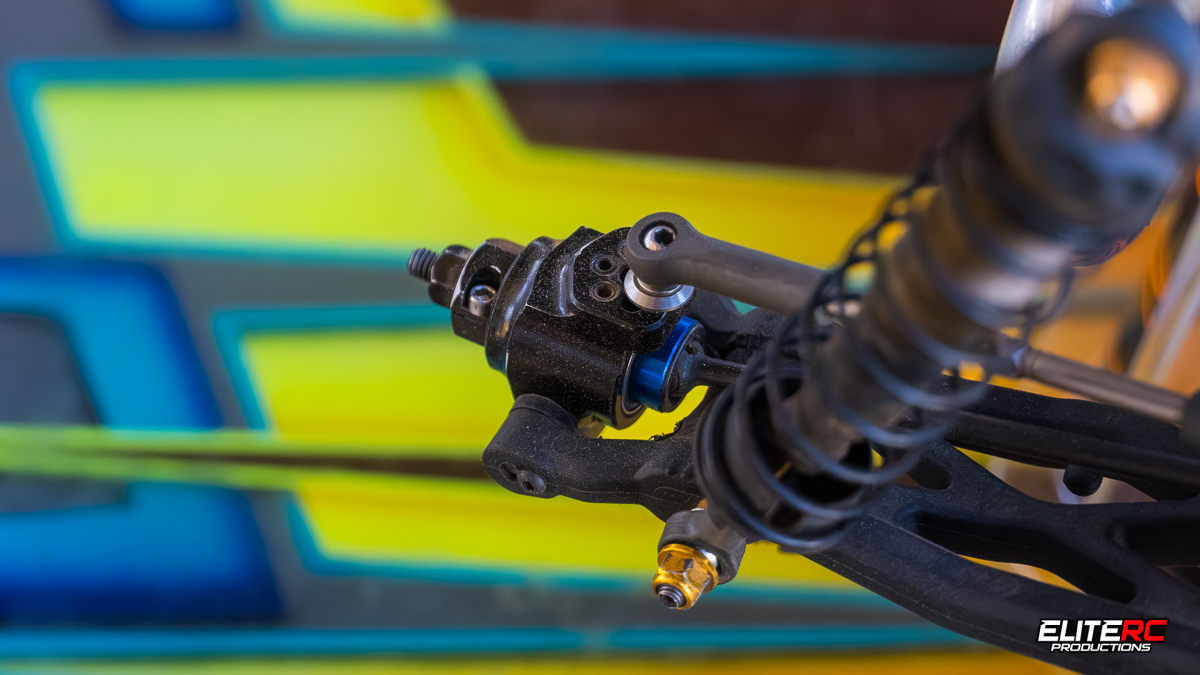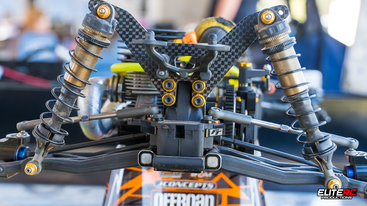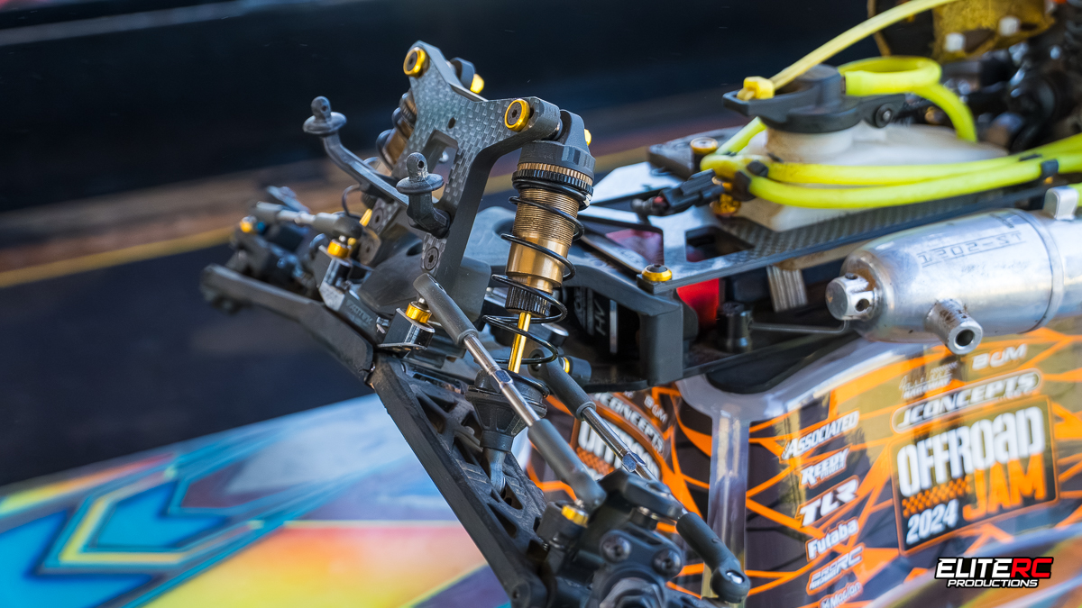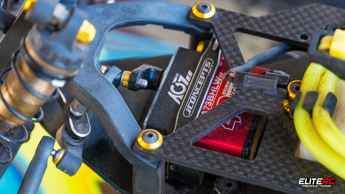 Jconcepts titanium upper shock standoffs – anodized gold to match the truck – attach the 13mm Kashima shocks to the Revolution Design 5mm Carbon shock towers front and rear. In the rear, many people run two Associated towers stacked together, and I found these Revolution Design parts are more than stiff enough to hold up, and are thinner than two stock towers without the need for very long shock screws or odd shock geometry. I run 2×1.5 + 2×0.7 hole 2.5mm pistons in the front, with 400cst oil and a white V2 truck spring, and 2×1.6 + 4×0.8 pistons and 400 cst oil in the rear with a green V2 truck sping. I also run the +4 shock ends in the rear for more droop when necessary and because of the amount of rear toe-in, find the truck is much more stable with the lower shock ends mounted with a 2mm ballstud spacer on the back of the rear arms.