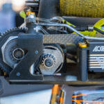 Most of the middle of the truck is stock. I use the old carbon top deck and Xray tank that comes with the original conversions. The top deck has had o-rings added in the screws going into the front chassis brace/top plate for a bit of flex, and the same thing is done on the transmission brace that is over the clutch in the rear. Jimmy Woodley of Ignite Design came out with a great 3-piece quick-change motor mount that makes servicing the engine or clutch a breeze. The JW12 has a very unique powerband – partially due to the clutch, which is incredibly important in gas truck. I use a 3-shoe clutch, with two aluminum (1.1 and 1.0 springs) and one carbon shoe (0.7 spring). This is the slide carb variant of the 5 port motor and it absolutely screams and has plenty of low-end grunt to pull a taller clutchbell/spur gear ratio. This engine runs great with an Ignite Design 1-piece tuned pipe/manifold.