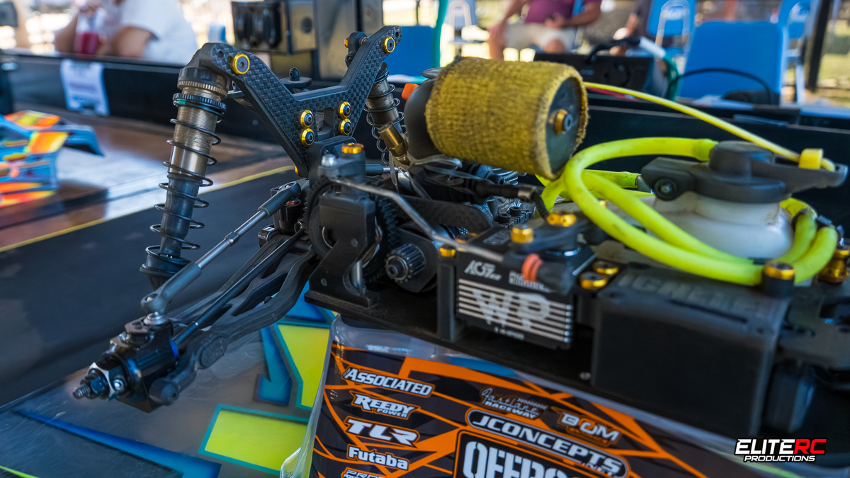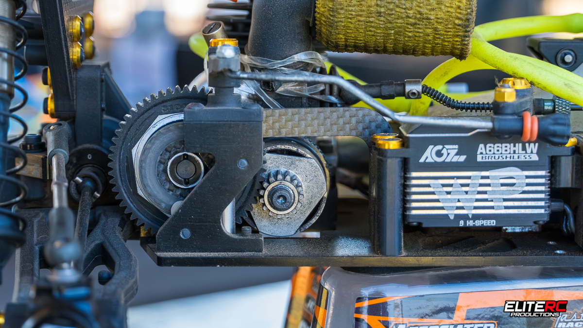 I run the T6.1/B64 style rear alloy hubs from associated, with newer 3.5mm turnbuckles and ballcups all around. I use factory axles in the front, but a very narrow 5mm hex in the rear over the stock 8.5mm hexes. The newest modification to the truck was to use the b74 extended CVA axles in the rear, with t5m 86mm dogbones. This has been the final piece that the truck really needed to gain confidence on power and to keep the rear end in check and hooked up, and it performed very well all weekend.