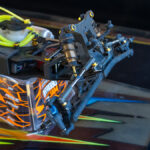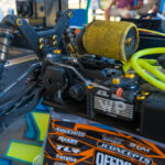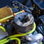 I stuck with J concepts Double Dees for the mains in green compound and mounted them to JC Racing Products 5-spoke wheels for a bit of vintage flair. The body is a JConcepts F2 for the Traxxas Rustler, which is significantly wider and clears the exhaust more easily. It also provides more room overall as it’s a bit taller to clear the head and air filter. I think it’s a better-looking body than the t6.1 F2, and I painted it for myself through AJRC designs, my painting business.