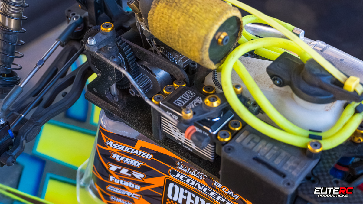 This truck largely remains a t6.1, as the arm inserts on the rear arms, flat front arms, and narrower rear pivots (pre b6.3) all benefit the truck over some of the newer geometry and designs, especially in low-grip outdoor conditions. I use a Sanwa M17, AGFRC Servos (33kg shorty for throttle/brake, 40kg standard HV for steering), all powered by a Protek 2100mah lipo receiver battery. The engine is a Classic RC Company JW12 5 port Launch Edition.